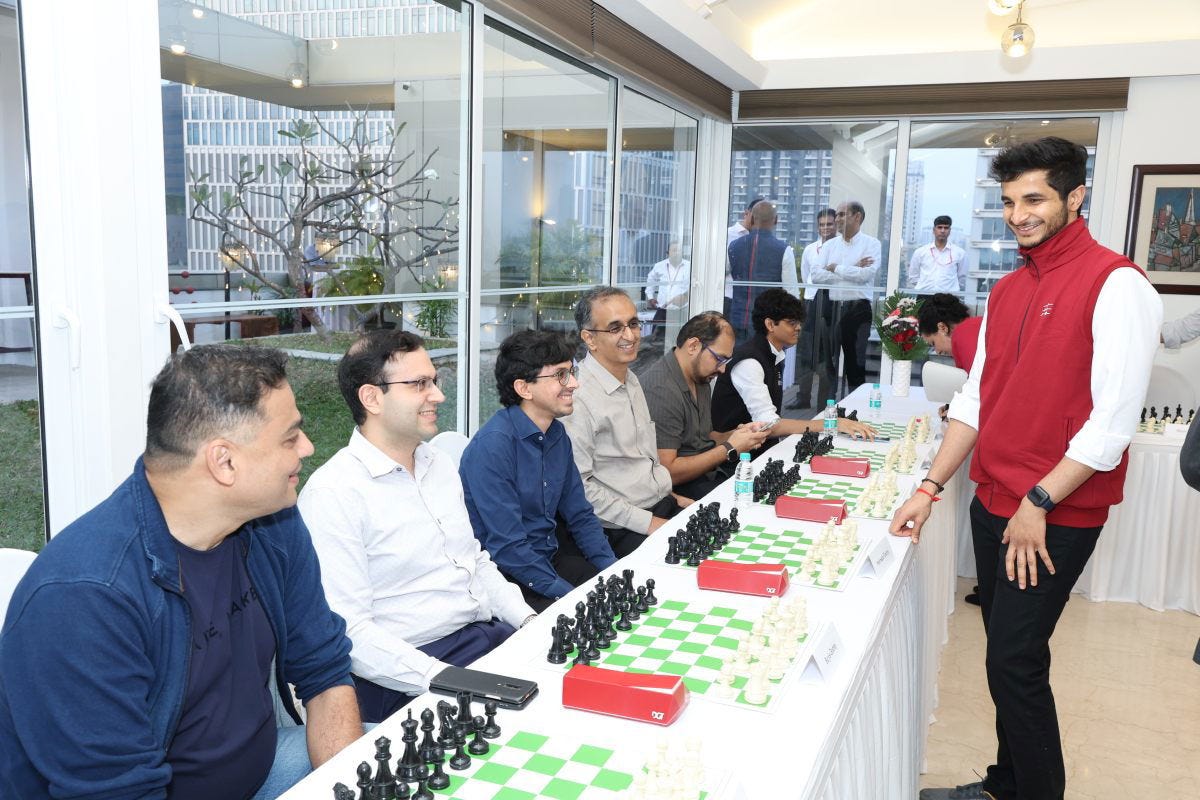 January 2024 is going to be an important month for Vidit Gujrathi as he gets ready for Tata Steel Masters in Wijk Aan Zee. However, just before he took his flight to Amsterdam, Vidit decided to spend a day at Ambit House in Mumbai. Along with meeting the top management team of Ambit, Vidit played a simultaneous exhibition with 17 opponents. This proved to be an exciting one as some of the players gave quite a tough fight to the India no.3. We bring you some moments from this beautiful evening.