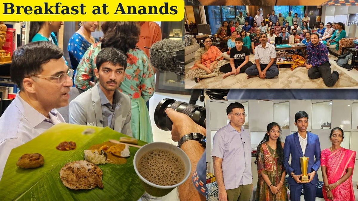 How difficult is it to get together 15 GMs and 21 titled players in one house on a Sunday morning for breakfast? Sounds impossible, doesn't it? What if we said it was not only possible, but 3 out of these players are top 25 in the world! This can happen only in one city in the world and that place in Chennai. The wonderful breakfast was hosted by Vishy and Aruna Anand and we bring you all the pictures from the this beautiful gathering. It not only had strong players, but also their family members who joined in. IM Sagar Shah shares the pictures from the day and also writes about his experience of visiting Gukesh's home later in the evening.