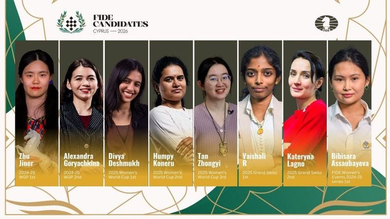 I would say there is much less variance in terms of strength in the women's section than in the open section. In just pure terms of strength, I do feel that Zhu Jiner with a live Elo of 2564 is one of the favourites in the tournament, but this is her first ever Candidates, and I am pretty sure that there would be a lot of pressure on her shoulders. On the other hand, Koneru Humpy has immense experience. She played a World Championship match in 2011, 15 years ago, and here she is now fighting it out in the Candidates. Tan Zhongyi has won the Candidates in 2024. So clearly she has been there and done that - just like Alexandra Goryachkina. Kateryna Lagno is someone who has been in the top in the world of chess for over two decades now. I do feel that Tan Zhongyi and Goryachkina have excellent chances in this group of experienced players.