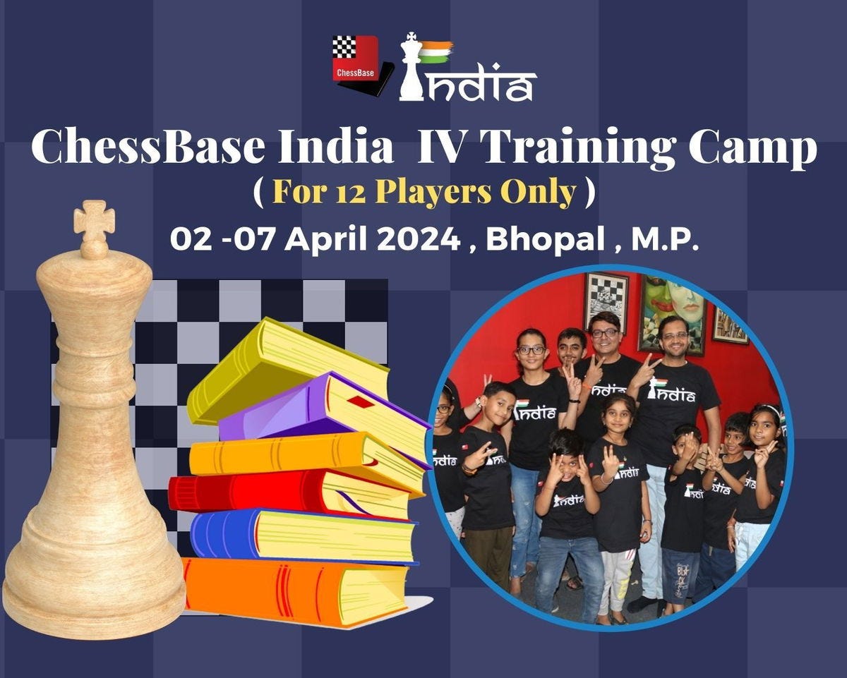 After many wonderful training camps organized in 2023, ChessBase India is bringing them once again in 2024! The first training camp of this year will be organized from 2nd to 7th April at the ChessBase India Training Academy located in Bhopal. Just like last time, a total of 12 players can participate in this camp. FIDE instructor Niklesh Jain and Women International Master Angela Franco of Colombia will be the trainers! This camp will run from Tuesday, 2nd April till Saturday, 6th April - after that, the next day on Sunday, 7th April, the participants of the camp will get a chance to participate in the ChessBase India Khelo Chess India Rapid Tournament among the players from all over the state! Read the article below to get more information:
