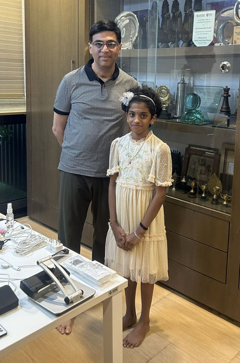 What Anand and Aruna did here is simply amazing! More than the effort, it was the thought that made this happen! Being a legend of the game, does Vishy Anand have to spend his time doing this? Not really. He can very well prepare for his upcoming tournaments, spend time with his family, work on his role at FIDE, prepare for his upcoming sessions at WACA, think about his latest book launch the lightning kid - his schedule is already filled to the brim. But amidst all of this he found time for the young girl. Sharvaanica is an incredible talent. At just the age of 10 she is already rated 2041 and is the current under-10 world champion. In all likelihood she will become a world class player. But this meet with Anand will give her that extra edge in my opinion.