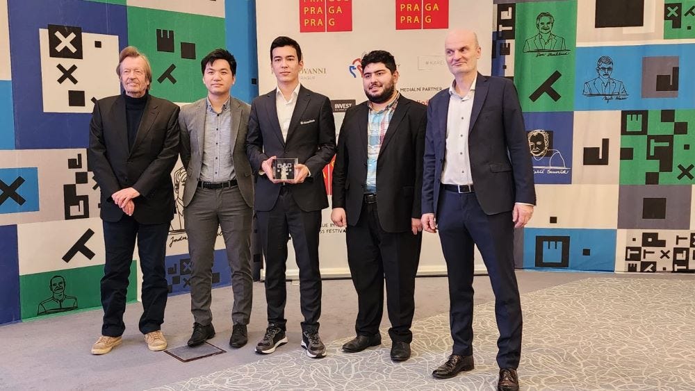 Nodirbek Abdusattorov (UZB) defeated Parham Maghsoodloo (IRI) to win 6th Prague International Chess Festival 2024 Masters. It was certainly not an easy win for the champion. He sacrificed his queen for a rook and knight. Then he had to navigate through a difficult endgame to earn the full point. This win also ensured, the former World Rapid champion move up to World no.4 in the live ratings. D Gukesh won against Vincent Keymer (GER). Aansh Nandan Nerurkar won the Futures section. He will play in the Challengers section at the next edition. IM Ediz Gurel drew against GM Erwin L'ami (NED) to secure his final GM-norm and become the latest Grandmaster of Turkey. Photo: Prague International Chess Festival