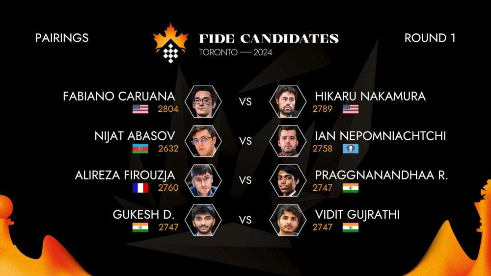 Pairings of the first round at Candidates 2024! Photo: FIDE Official Website