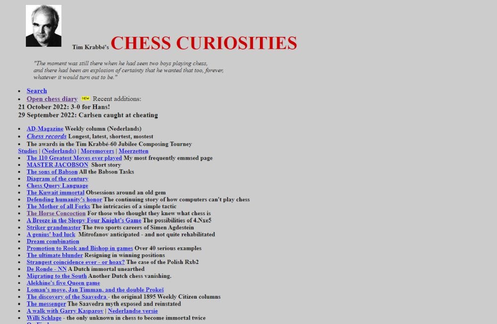 Tim Krabbé is a strong chess player from Netherlands - one of their top 20 players at some point, with a peak rating of 2290. But this hardly describes what Krabbe does: he is a journalist, novelist, chess author, dabbled in acting for quite some time - chess player is like the bottom of the list! His novels have been translated to 16 languages, and five of his novels have been turned into movies. Discussing all the facets of Tim's career will easily require a whole book. But today I want to talk about the fantastic chess website he created - Tim Krabbe's Chess Oddities.