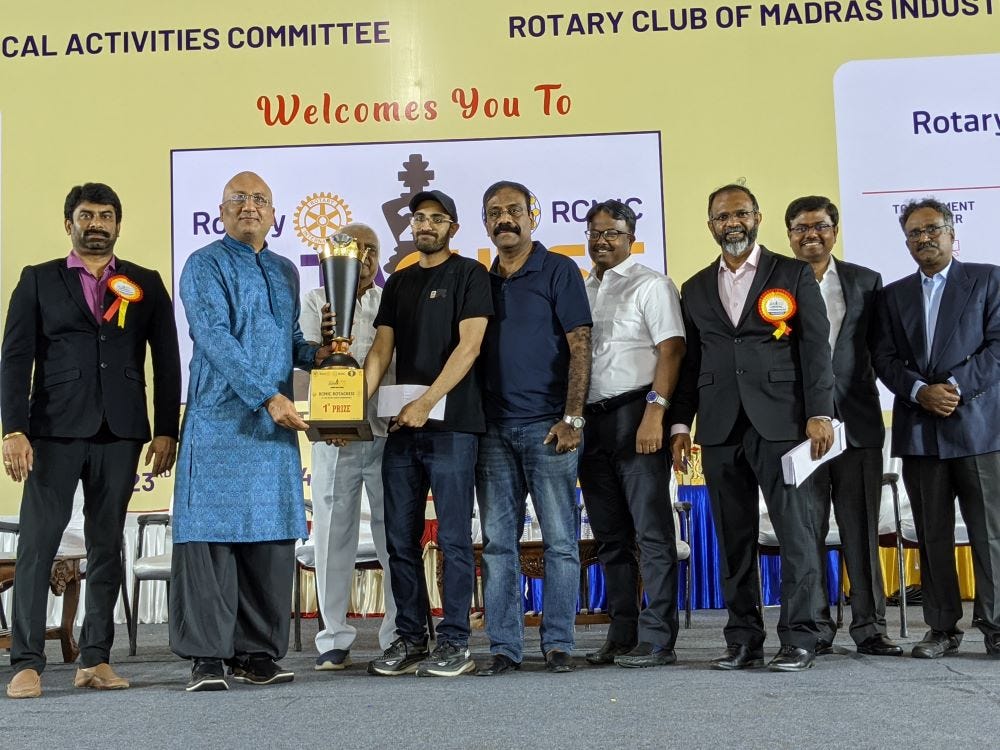 Four players - GM Vaibhav Suri, GM Pranesh M, IM Ilamparthi A R and FM Ram Aravind L N scored 8/9 each at 2nd RCMIC Rotachess Rapid Rating Open 2024. Vaibhav became champion due to better tie-break score. The remaining three were placed second to fourth according to tie-breaks. Top three remained undefeated. The total prize fund of the tournament was โน600000. The top three prizes were โน80000, โน50000 and โน40000 along with a trophy each. The tournament was organized by YMCA Madras Physical Activities Committee, Rotary Club of Madras Industrial City and T Nagar Chess Academy at YMCA Royapettah in Chennai, Tamil Nadu on 23rd June 2024. Check out a huge report of the tournament with lots of photos, games, videos and few interviews. Photos: Shahid Ahmed