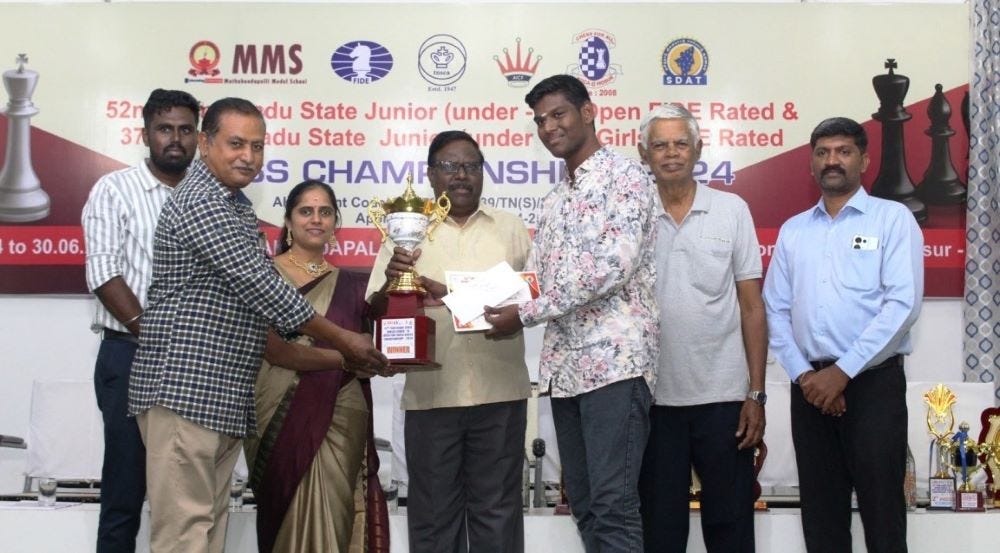 G Nigash scored an unbeaten 8/9 to win 52nd Tamil Nadu State Junior Under-19 Open Rating Championship 2024. He finished a half point ahead of the rest. V Tarun and S Rohith scored 7.5/9 each. They secured second and third place respectively according to tie-breaks. WFM Keerti Shree Reddy and Sindhusree K scored 7.5/9 each in 37th Tamil Nadu State Junior Under-19 Girls. Keerti won due to better tie-breaks, Sindhusree secured second place. V C Nivedita finished third scoring 7/9. The total cash prize fund of the tournament was โน60000. The top three prizes were โน7000 + trophy, โน5000 and โน4000 each. The five-day rating tournament was organized by Krishnagiri District Chess Association at Mathakondapalli Model School in Hosur, Tamil Nadu from 26th to 30th June 2024. This is Nigash and Keerti's first rating tournament triumph of the year. Photos: IA R Anantharam