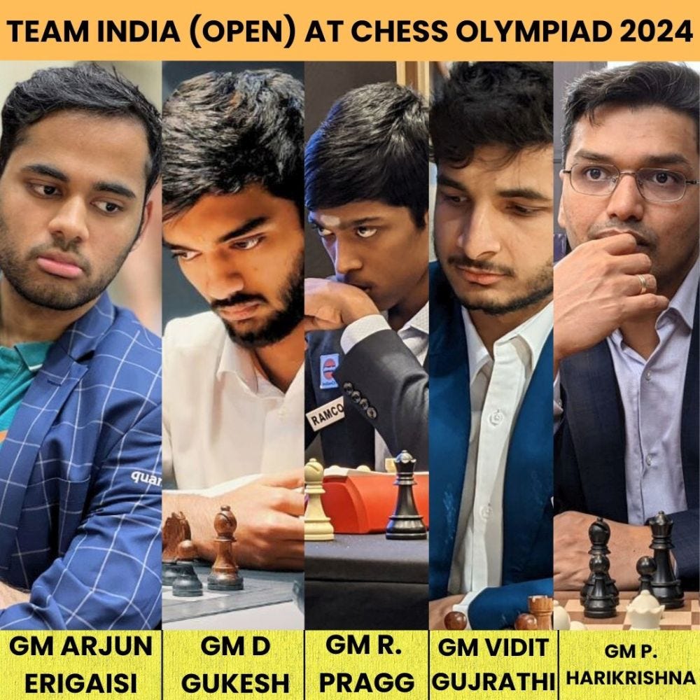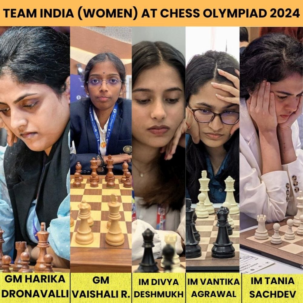 In the women's section team India consists of Harika, Vaishali, Divya Deshmukh, Vantika Agrawal and Tania Sachdev. This team is extremely strong, but we are surely going to miss India's top player Koneru Humpy on the top board. The reason she mentioned for skipping this Olympiad is that she had already confirmed some events before hand and does not want to play back to back events. Harika on the top board played her first Olympiad in 2004 and since then she hasn't skipped a single Olympiad. She loves representing the country and that was seen in ample measure when in her 9th month of pregnancy she played at the Chess Olympiad in 2022. It was one of the most inspirational stories of the entire Olympiad. R. Vaishali recently entered top 10 female players in the world and is definitely a world class player. Divya Deshmukh has made rapid strides in recent months and will rightfully claim the third board for the team. On board four we have the talented Vantika Agrawal and Tania Sachdev will be on board no.5. Tania has been selected by Jio Cinemas to commentate on the Paris Olympics that is beginning in a few days - and then will represent the country at the Chess Olympiad - an amazing achievement to be a commentator as well as a player! India team captains are - Srinath Narayanan in the open and Abhijit Kunte in the women - just like the previous edition.
