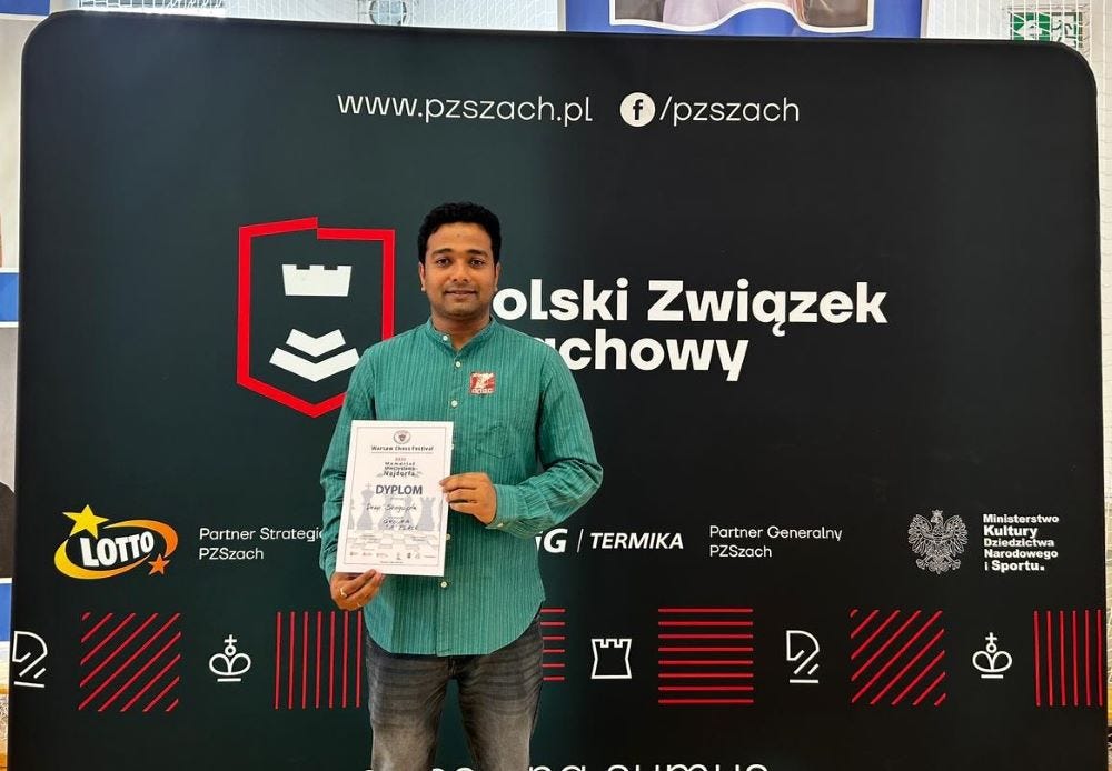 GM Deep Sengupta and GM Eduardas Rozentalis (LTU) scored 7.5/9 each at 23rd Najdorf Memorial A 2024. Deep won the tournament due to better tie-breaks, Eduardas was placed second. GM Valery Kazakouski (LTU) and GM Lukasz Jarmula (POL) scored 7/9 each. They secured third and fourth place respectively. The multi-time Hastings Masters and former Commonwealth gold medalist won this tournament for the second consecutive year. This time he bettered his performance by scoring a half point more and remained undefeated. The total prize fund of the festival was 45000 PLN, 24000 PLN in A, 12000 in B and 9000 in C. The top three prizes were 8000, 4000 and 3000 PLN each respectively in the A category. This is Deep's second rating tournament triumph of the year.