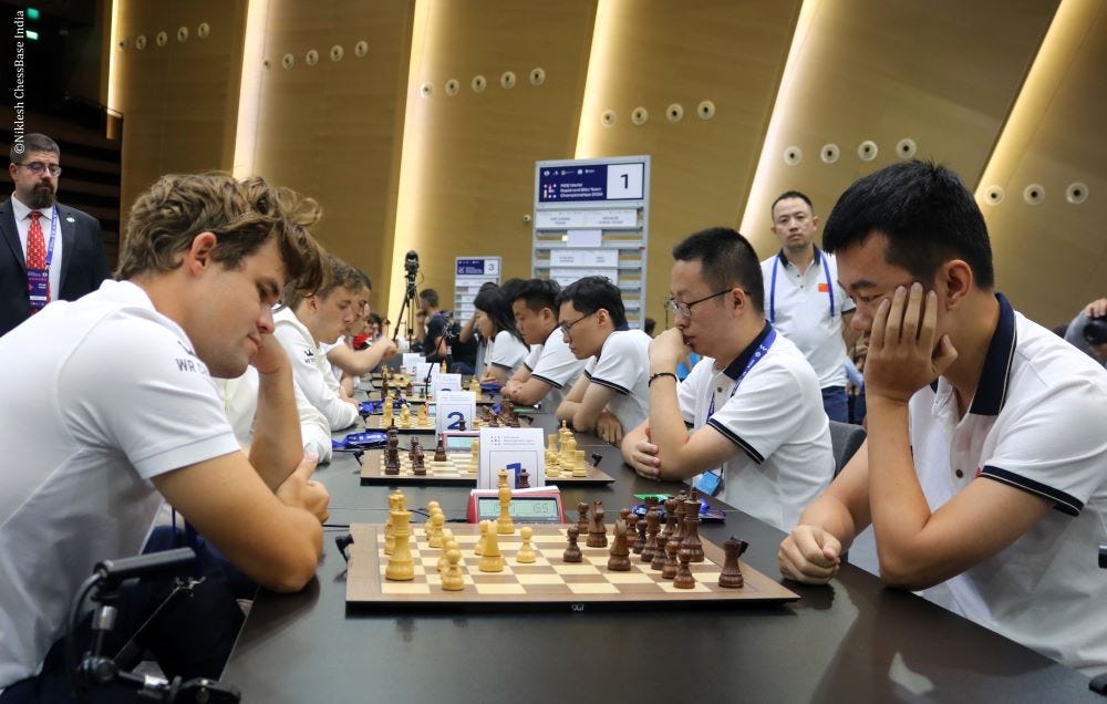Al-Ain ACMG UAE has emerged sole leader 14/16 after Round 8 of World Rapid Team Championship 2024. They started the day by handing WR Chess their second consecutive loss. Then they drew with one of then coleaders, Chessy. Royal Chess and Q4Rail Kingsofchess Krakow were the next two teams to go down against the sole leader. Decade China is the only other team who is undefeated along with the sole leader. They are at 13/16. Chessy and MGD1 are third place 12/16 each. MGD1 defeated Chessy to finish the day on a high note and reduce the gap. Magnus Carlsen's team, the defending champions are lagging behind at fifth place 11/16 with Ashdod Chess Club. Round 9 starts today at 2:30 p.m. local time, 3 p.m. IST. Photos: Niklesh Jain