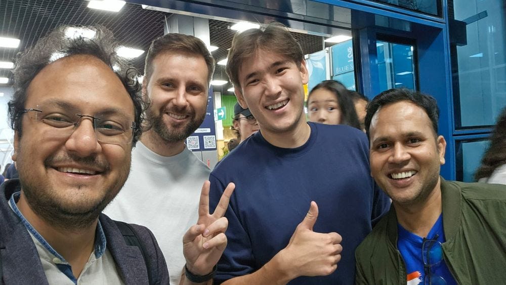 Sagar and Niklesh at the Almaty airport with Roman and Kuyash - the people building an unique app called Chess Legends!