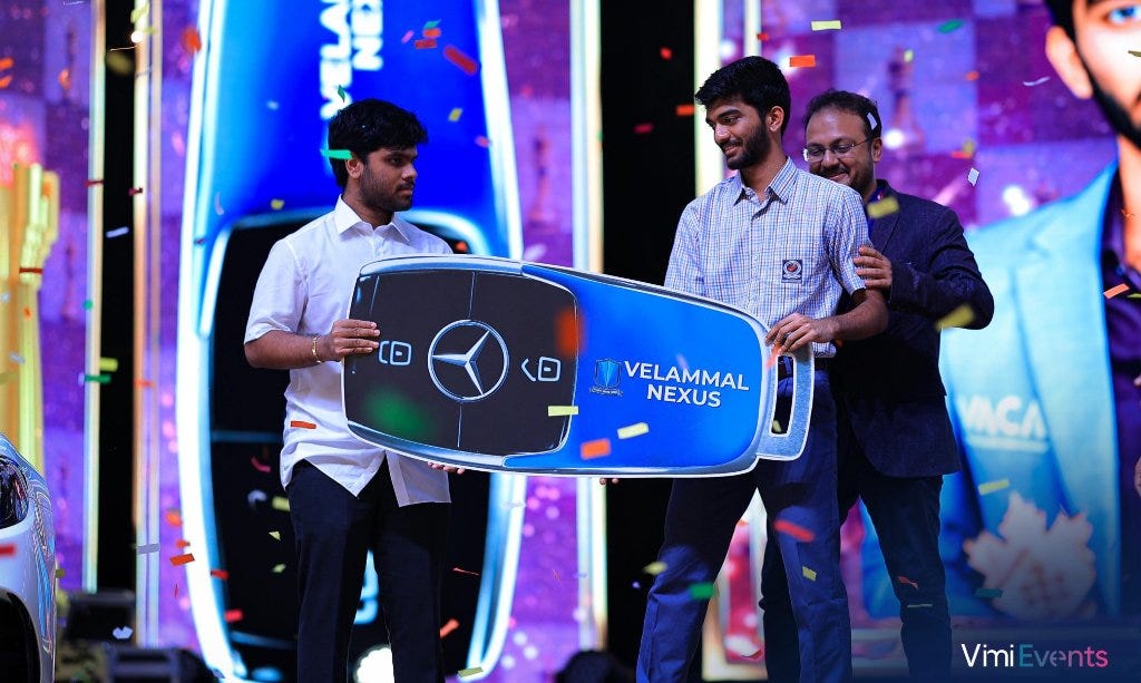 There are many things that I learnt from my trip to Chennai, where Gukesh was felicitated by the Velammal school with a Mercedes Benz. But if there was one thing that would top the list, it is the way in which Velammal school portrayed Gukesh and his achievements. Because I was present there, I could feel the energy. I could feel that the kids were getting inspired by Gukesh and his conduct. Instead of inviting role models from outside (like Dhoni, or Kohli or any other sports players) they invested in making the program impeccably organized - laser shows, drone shows, amazing dance numbers and at the end of it, I felt Gukesh was nothing less of a rockstar!