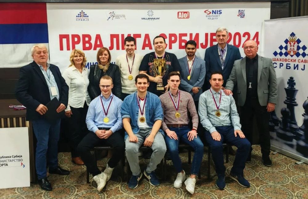GM Abhimanyu Puranik scored an unbeaten 7.5/10 to ensure his team ZMAJ (Beograd) win the Serbian First League 2024. This was the second time Abhimanyu won this event for the same team. Previously he won it in 2022 scoring 8/11. Both Abhimanyu and IM Mihajlo Radovanoic scored the same 7.5/10, only Abhimanyu remained undefeated. ZMAJ - Beograd scored 24/33, finished a full points ahead of the runner-up, SLOVEN (Ruma) 23/33. JUGOVIĆ (KAĆ) scored 22/33 to finish third. The eleven day, eleven round Round-Robin team league was organized by Šahovski savez Srbije (Chess Federation of Serbia) from 27th September to 7th October 2024 at Hotel Cepter Drina in Bajina Bašta. This is Abhimanyu's third triumph of the year. Photo: Šahovski savez Srbije
