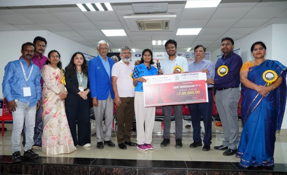 WGM Nandhidhaa P V (TN) scored an unbeaten 9/11 to win 50th National Women Championship 2024. This is her first National Women title. WIM Priyanka K (TN), IM Padmini Rout (PSPB) and WGM Kiran Manisha Mohanty (LIC) scored 8.5/11 each. They secured second to fourth place according to tie-breaks. Nandhidhaa defeated WGM Priyanka Nutakki (AP) in the final round to become the champion. She also won against the defending champion, Padmini in Round 9. The total prize fund of the tournament was ₹3000000. The top three prizes were ₹700000 + trophy, ₹550000 and ₹450000 each. The eleven-day eleven round Rating tournament was organized by and at Chettinadu Public School in Karaikudi, Tamil Nadu from 3rd to 13th October 2024. This is Nandhidhaa's first tournament triumph of the year and she secured her place in the FIDE Women's World Cup 2025. Photo: IA V Vijayaraghavan