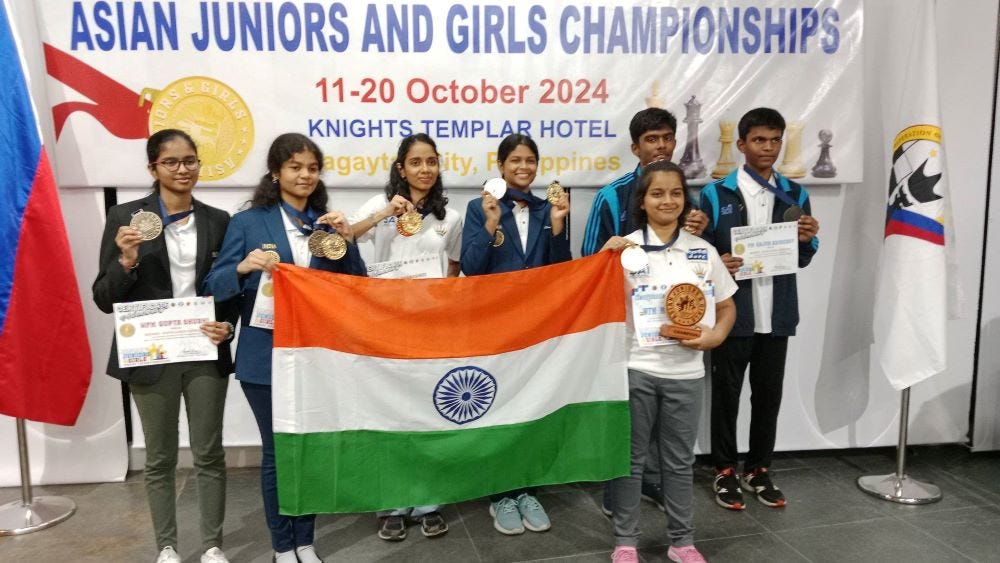 Seven Indians have won a total of 12 medals at Asian Junior Chess Championships 2024. WFM Bristy Mukherjee won the sole Gold for India in the Blitz Girls event. She scored an unbeaten 8/9 and finished a full point ahead of the field. Sneha Halder and the defending champion, WIM Tejaswini G scored 7/9 each in Classical Girls event. Sneha secured Silver due to better tie-breaks. Tejaswini got Bronze. IM Aswath S won Bronze in Classical Open scoring 6.5/9. Aswath and FM Arjun Adireddy scored 6.5/9 each in Rapid Open. They won Silver and Bronze medals each respectively. WFM Shubhi Gupta claimed Bronze scoring 6/9.
