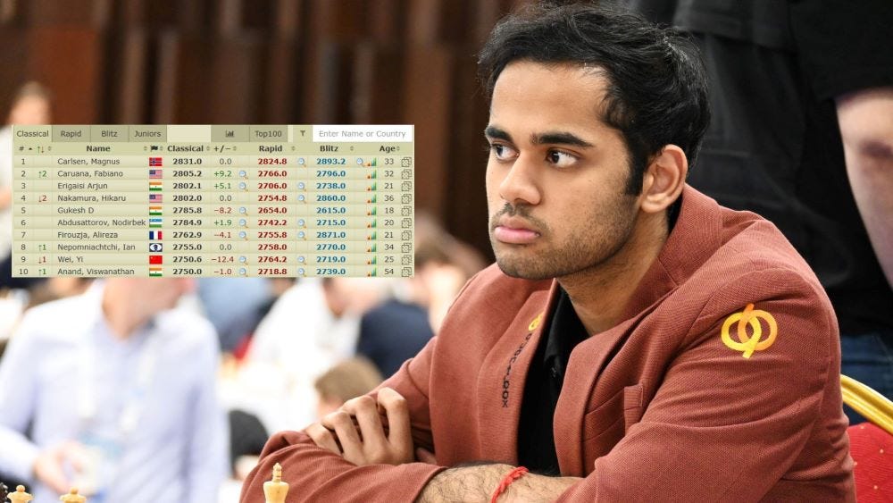 Arjun Erigaisi crosses 2800 in live ratings!