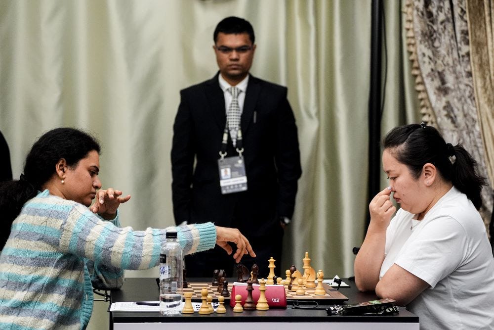 GM Koneru Humpy won her first game at FIDE Shymkent GP against IM Batkhuyag Munguntuul (MGL). The Mongolia no.1 woman misplaced her queen. Things spiraled out of her control after that. IM Divya Deshmukh did not capture the d5-pawn at the right time, probably fearing 27...Ne4. Instead, she played 27.f3 which just created weakness on the kingside and things spiraled out of control. The current Women's World Championship Challenger, GM Zhongyi Tan (CHN) defeated GM Kateryna Lagno with a beautiful knight sacrifice, followed by a rook sac to win her second game here and gain sole lead 2.5/3. Humpy will battle against IM Nurgyul Salimova (BUL) and Divya will face Zhongyi in Round 4. Photo: FIDE/Konstantin Chalabov