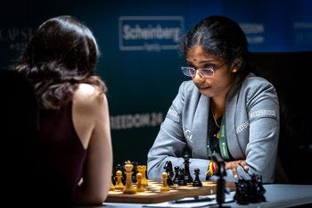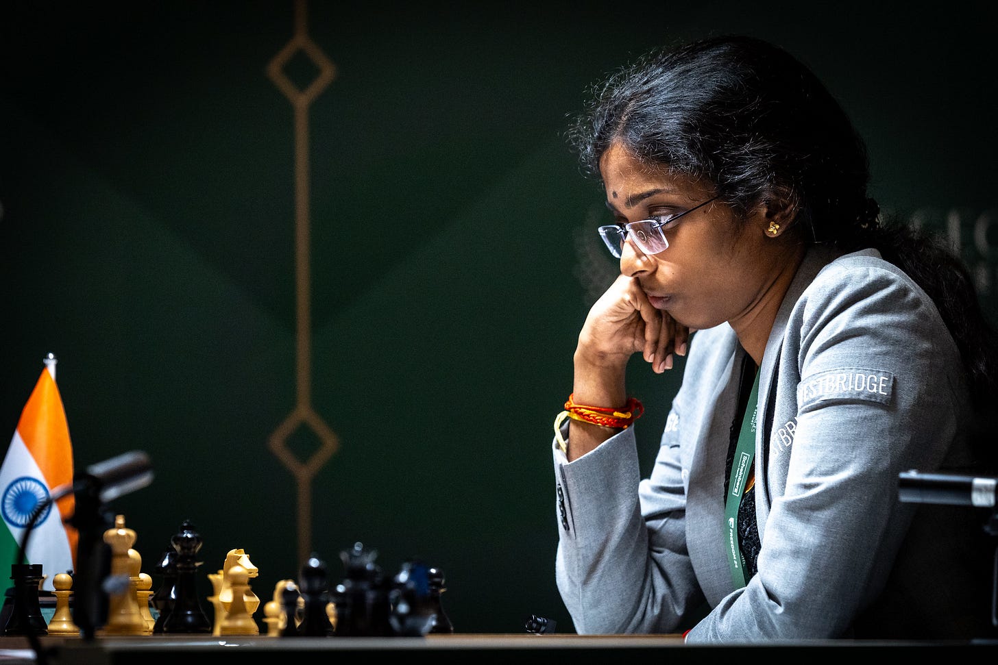 Coming to the star of the women’s event and the big news of Indian chess - R. Vaishali. Vaishali, who often doesn’t speak much, has let her moves do the talking in this event (like always!). She is currently leading the women’s section by one full point - 7.0/11. She has 3 strong opponents left and big challenge today in the form of Zhu Jiner. I hope Vaishali would be able to keep her cool and make it to the World Championships to face Ju Wenjun. It would be another huge boost for Indian chess. Women’s World title is something that has been missing from the achievement of India as a country. Humpy reached the World Championship match in 2011, but lost it at the final hurdle against Hou Yifan. We hope Vaishali would be able to better it. Also what an amazing achievement this would be for WestBridge as a sponsor. Gukesh sponsored by them plays in the open world championship and Vaishali in the women’s.
