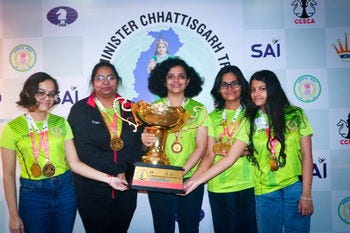 The Petroleum Sports Promotion Board scored 12/14 points to win the 23rd National Women’s Team Chess Championship 2026. Airport Authority of India and PSPB both scored 12/14 points, but a better tie-break score helped PSPB clinch the title. West Bengal, Uttar Pradesh, Andhra Pradesh B, and Telangana A scored 9/14 each to secure 3rd to 6th place, respectively. The total prize fund of the tournament was ₹5,00,000. The top three prizes were ₹1,25,000, ₹1,00,000, and ₹75,000 each. The championship was smoothly organized at Agrasen Dham, Raipur, Chhattisgarh, by Chhattisgarh State Chess Association from 16th to 22nd March 2026. Photos: Ayush Jain/ChessBase India
